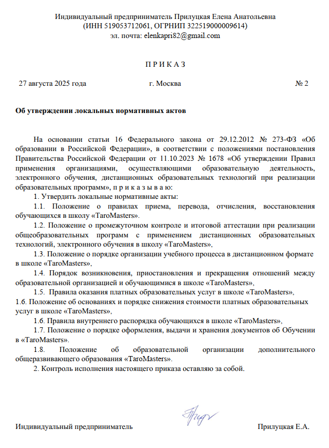 Правила оказания платных образовательных услуг в школе «TaroMasters»